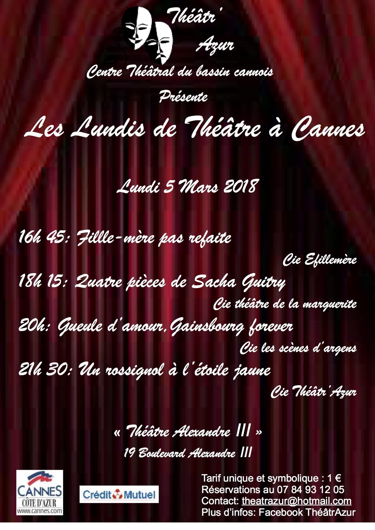 l'association THEATR' AZUR et la mairie de Cannes vous propose au théâtre ALEXANDRE III « LES LUNDIS DE THEATRE A CANNES » ainsi que les rencontres «THEATRALIES DE CANNES », actions destinées à promouvoir en particulier le théâtre régional au coeur de la cité cannoise. Elles réuniront des troupes professionnelles et non professionnelles, indépendantes ou fédérées, à divers stades de leur évolution, et proposeront un répertoire diversifié de genres et de styles.